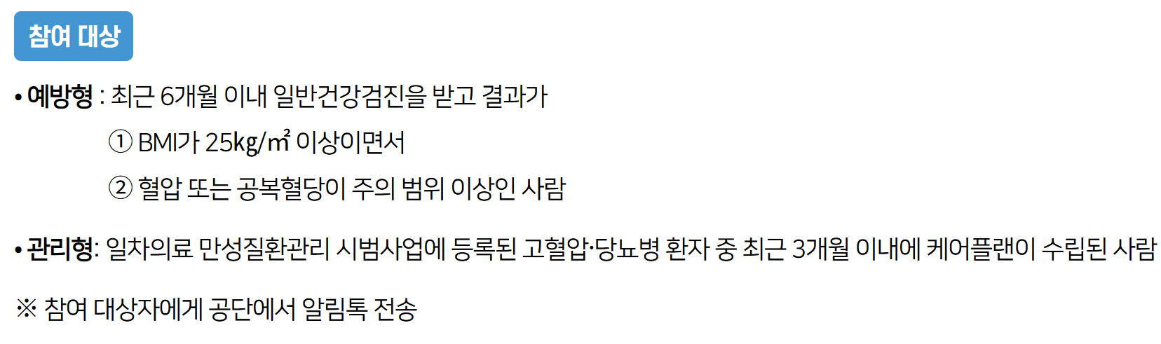 • 소득 무관, 고혈압·당뇨만 있으면 누구나 가능.